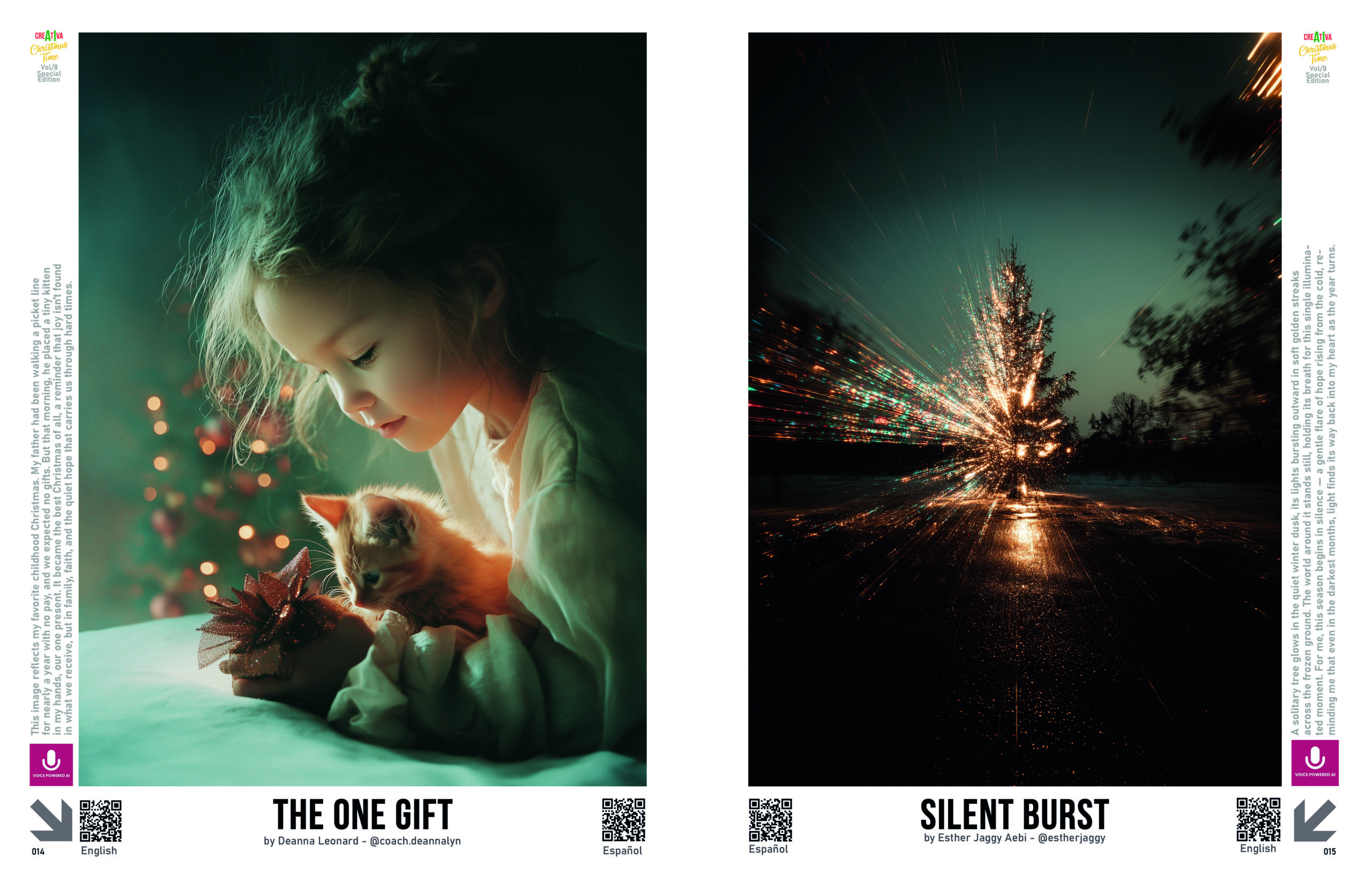 Thanks to our collaboration with Voice Powered AI, the narrative can not only be read but also listened to in both Spanish and English by scanning the QR codes on each image. In this way, you will not only read each story, but also hear it, enhancing and expanding the reader’s experience. (Voice in English, cloned with Voice Powered AI provided by Stewart Rogers)